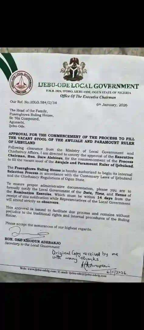 The Fusengbuwa Ruling House has received formal approval from the Ijebu-Ode Local Government to begin its internal selection process for nominating a new Awujale of Ijebuland.