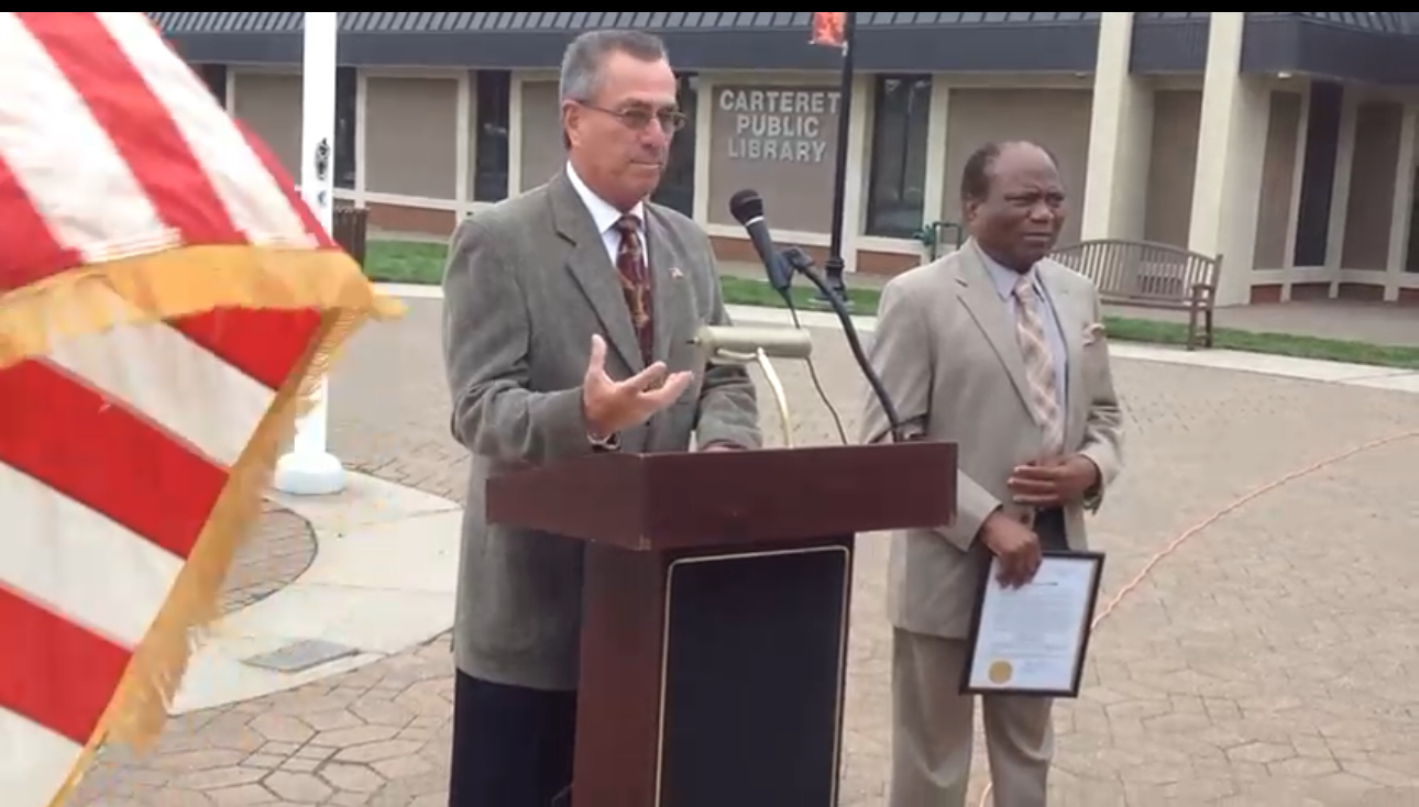 Mayor Ryman of Carteret Borough at the podium with U.S. flag.