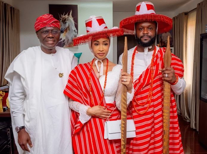 In an update published by The Nation, Seyi Tinubu and his wife were photographed at a Lagos ceremony linked to the Eyo Oba institution, where they were reportedly conferred with titles.